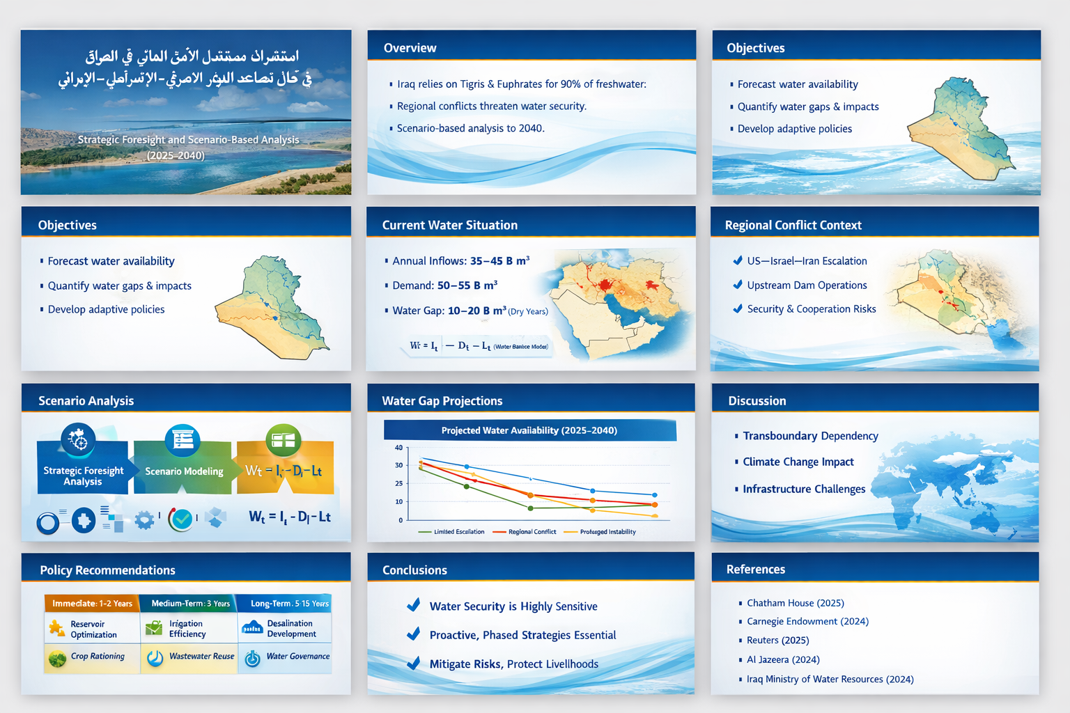 نحو دبلوماسية مائية وقائية وتوصيات لحوكمة مستدامة لمعالجة مخاطر المياه في بلاد الرافدين.؟سوء إدارة الموارد المائية وغياب البعد الاستراتيجي في سياسات الحكومة لإدارة هذا الملف الحساس في العراق كدولة مصب، مما يبرز مخاطر المياه كحالة لعدم الاستقرار السياسي في