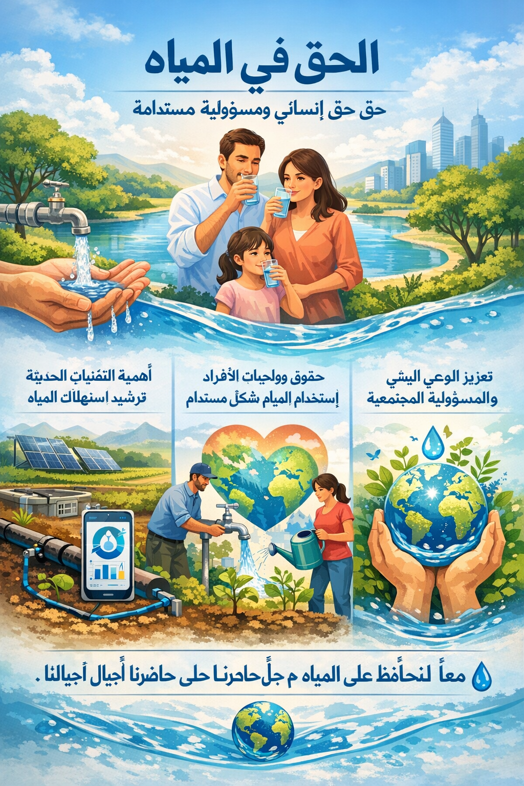 الحق في المياه: بين البعد الإنساني ومسؤولية الاستخدام المستدام يُعدّ الحق في المياه أحد الحقوق الأساسية للإنسان، إذ لا يمكن تصور حياة كريمة أو صحة جيدة دون توفر مياه آمنة وكافية للاستخدام اليومي. وقد اعترفت الأمم المتحدة بهذا الحق بوصفه جزءاً من منظومة حق